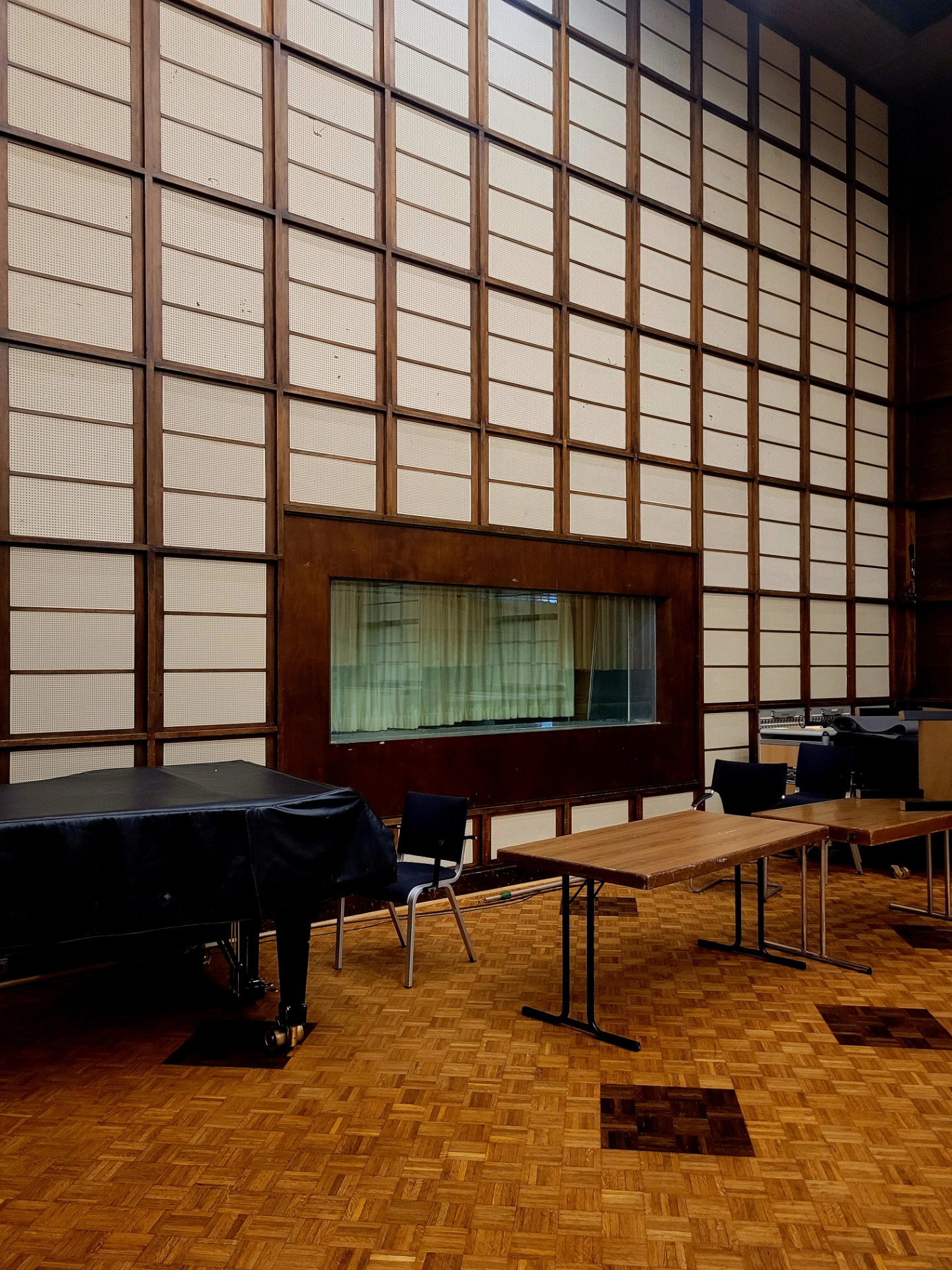 The hall is also equipped with curtains. It is said that during the period when the Haus des Rundfunks stood on what was known as the “Red Island,” soldiers of the Red Army slept in this very room. History lingers quietly between wood and fabric.