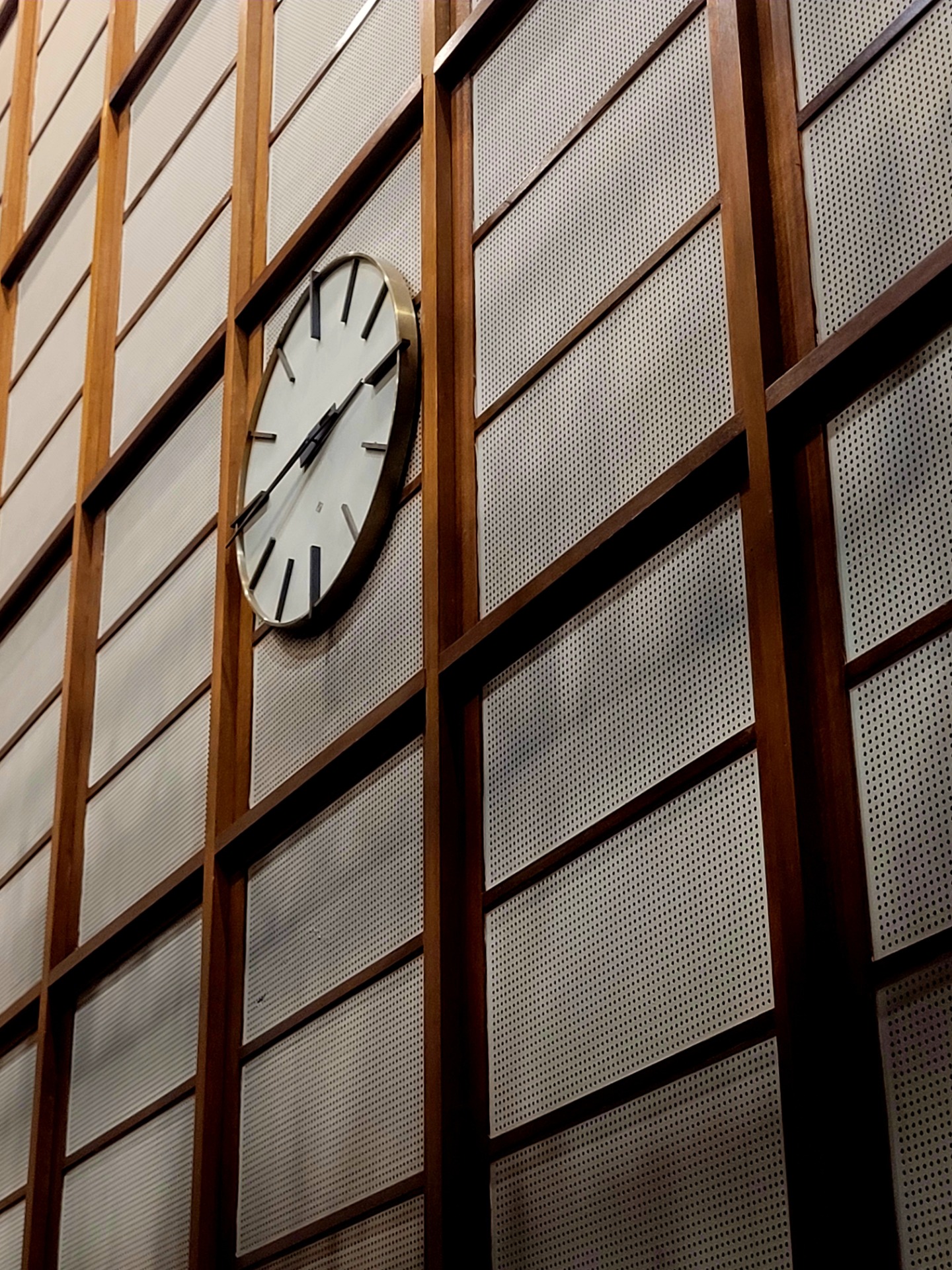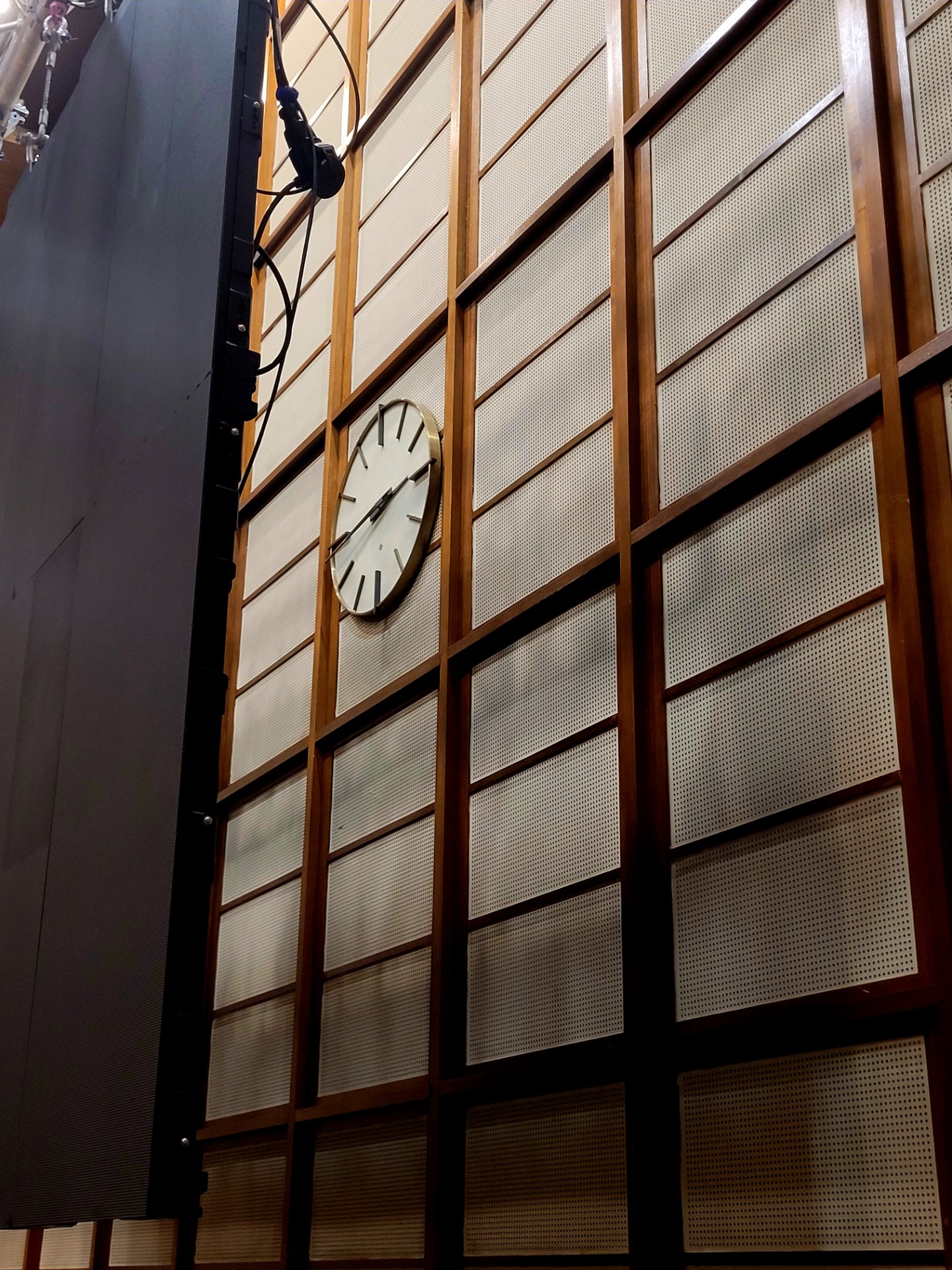 In one room; power and time converge. Warm acoustics return and the clock remains.