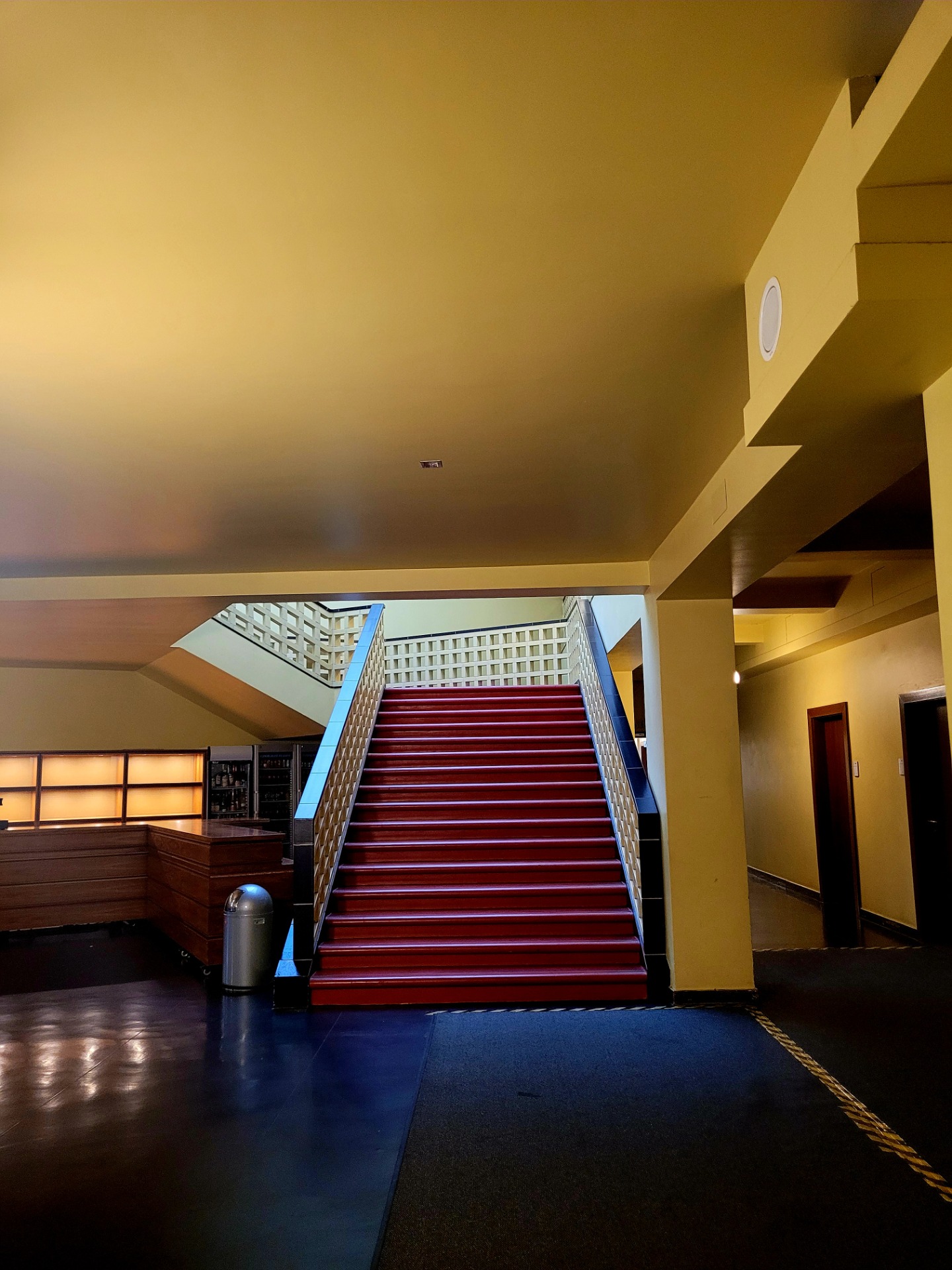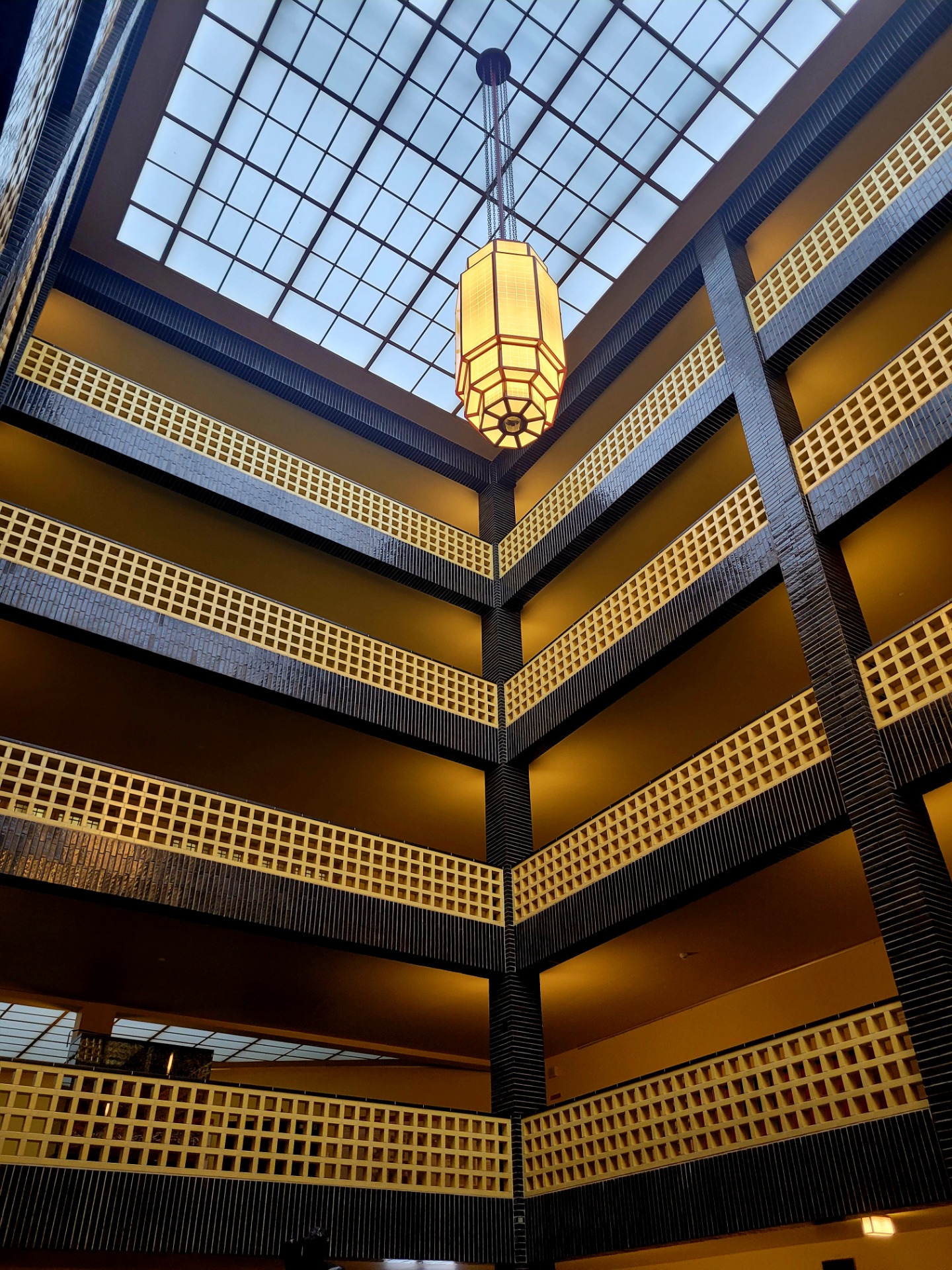 Five floors rise upward; eight glossy black ceramic columns provide quiet strength. The iconic lamps hover like steady suns. Yellow brickwork bathes the atrium in golden light, regardless of the geopolitical climate outside.
